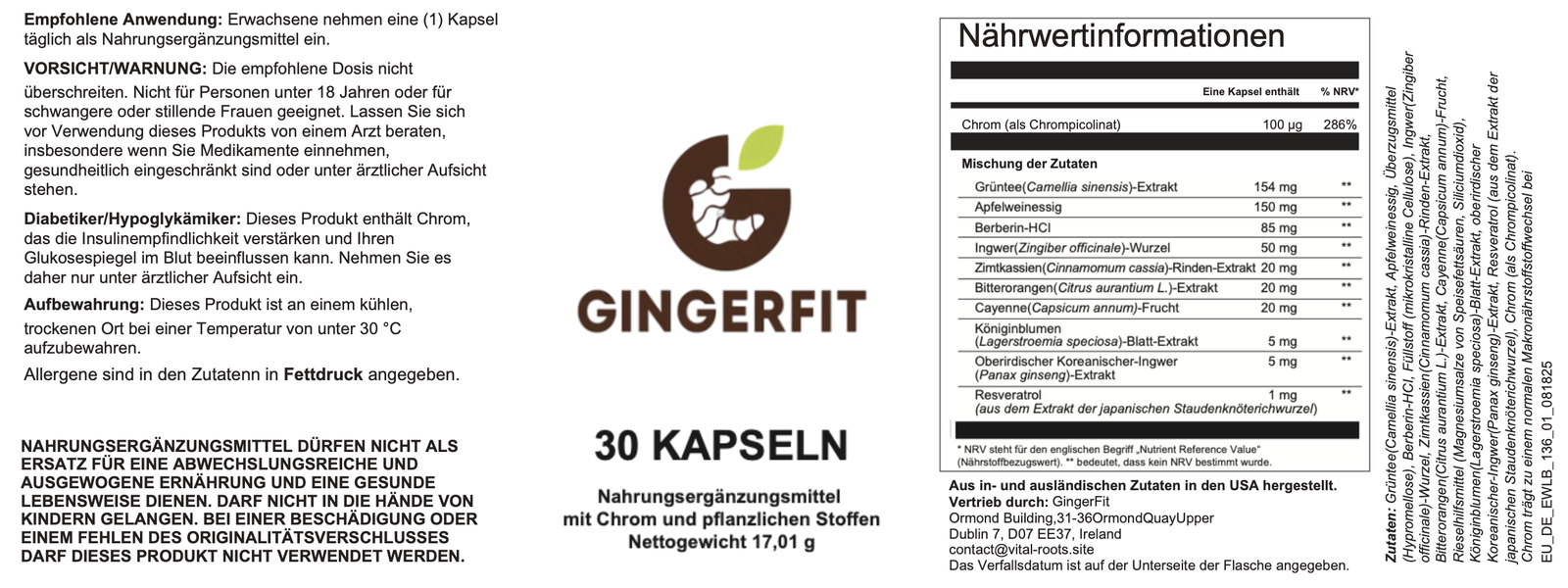 ✔︎ enthält Ingwerextrakt (Zingiber officinale), der die Verdauung unterstützt und das allgemeine Wohlbefinden fördert.